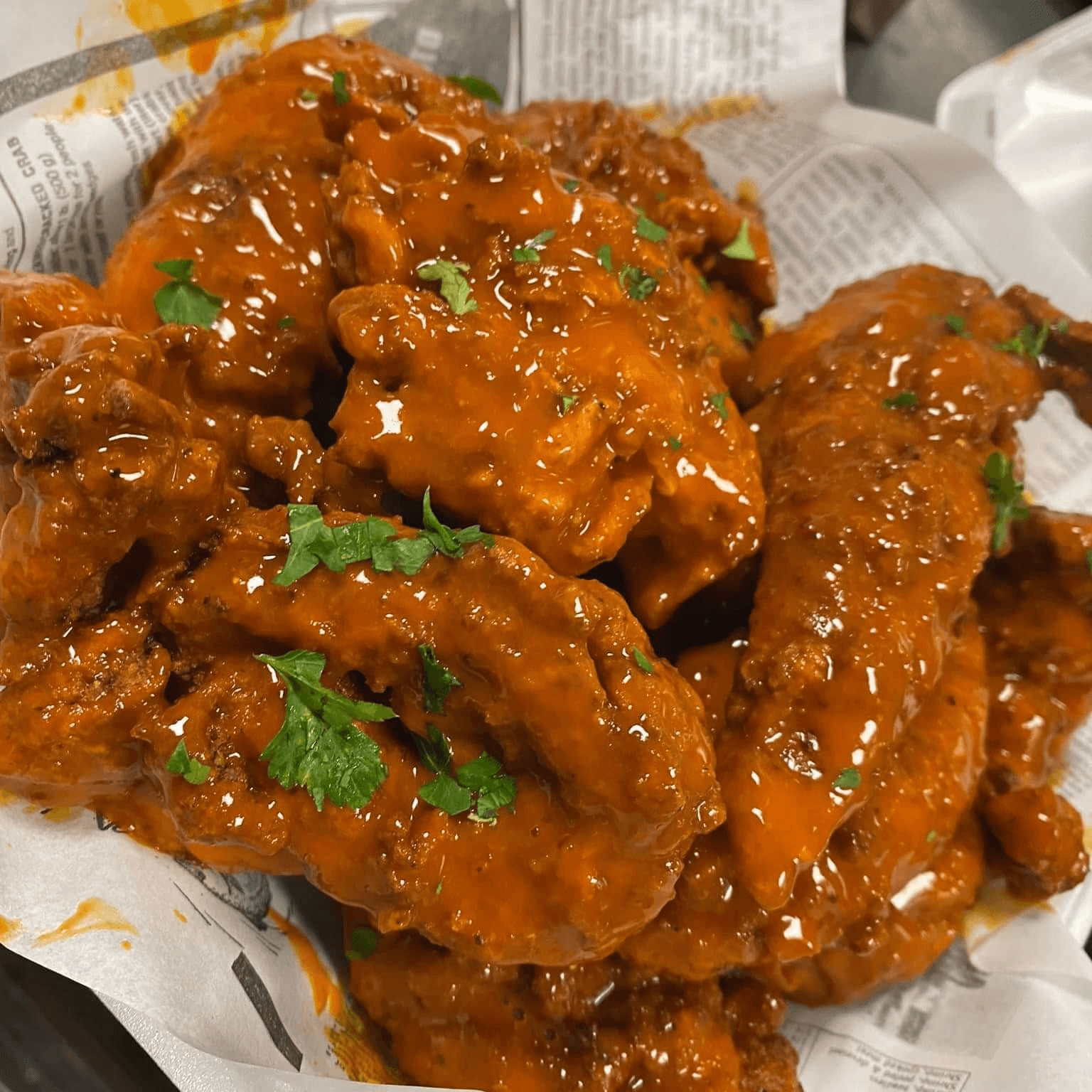 Crispy Calamari Tossed In Buffalo Garlic Sauce With Deep Fried Cherry Peppers Served With A Side Of Blue Cheese